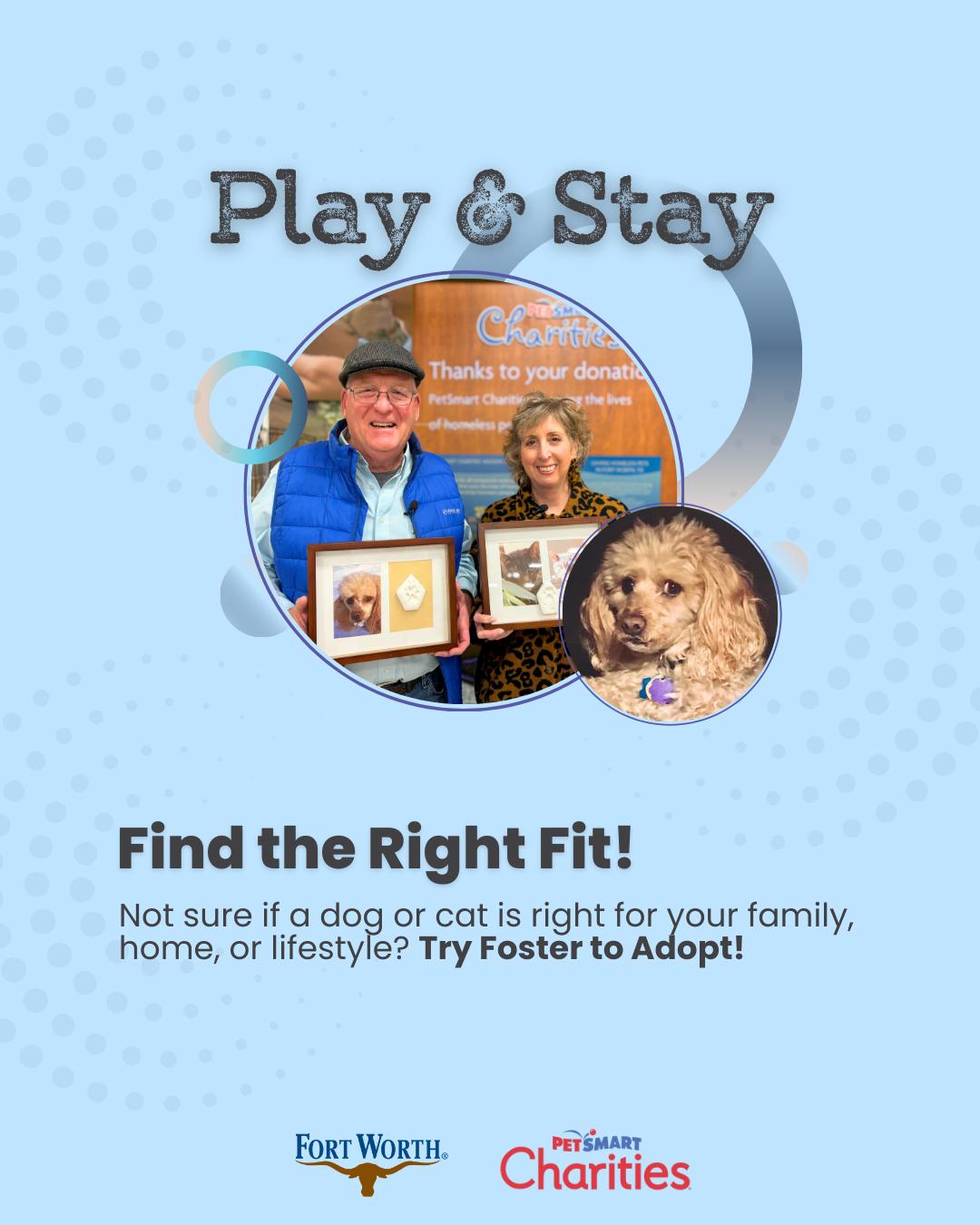 If you have someone interested in your foster pet and think Play & Stay may be a good option, reach out to the foster team or direct the potential adopter to visit the shelter or a PetSmart Adoption Center to get started.