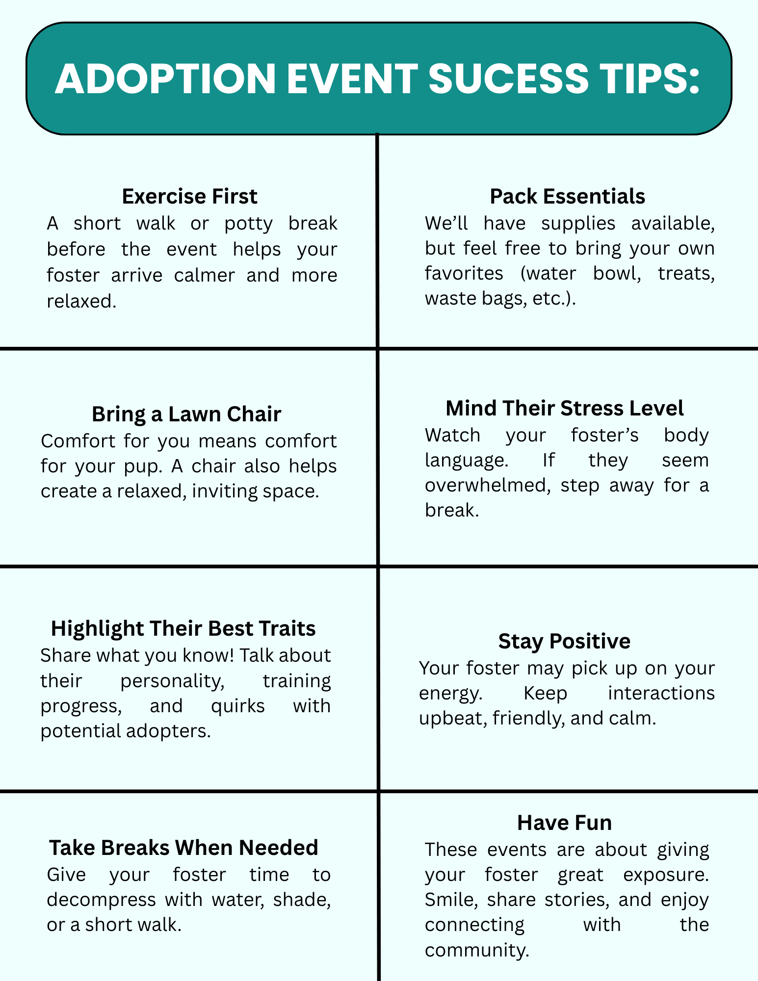 This web page is your go-to spot for upcoming adoption events and helpful tips to get your foster pet adopted. We’ll keep it updated with opportunities to showcase your pet and share strategies to help them stand out. Be sure to check back often for new ideas and event announcements!